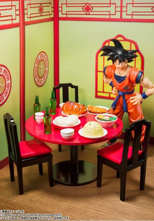 Re-create dynamic dining scenes with Son Goku’s Hara Hachibunme restaurant set! Designed for the S.H.Figuarts series, it includes a table, chairs, and plenty of food dishes and drinks — an instant party, ready for your tabletop or display! It also includes a food-gulping expression part for the S.H.Figuarts Son Goku – A Saiyan Raised On Earth – (sold separately). Chopsticks and forks are included, too, expanding your posing possibilities!