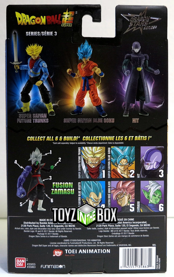 The Dragon Ball Stars Series is comprised of the most highly detailed and articulated figures in the Dragon Ball line. Standing at 6 1/2-inches tall and having 16 or more points of articulation and additional hands, these figures can be posed in hundreds of positions. The Stars action figure line includes many characters from Dragon Ball‘s rich history. Figures come packaged with an exclusive collectible piece that can be combined to form the Fusion Zamasu! Each figure sold separately.