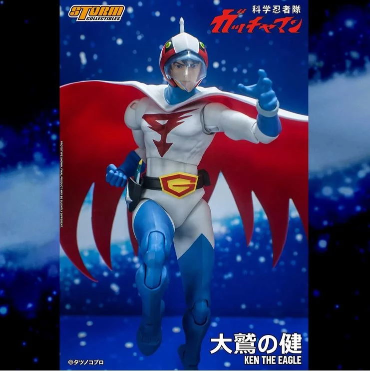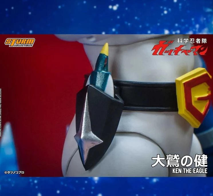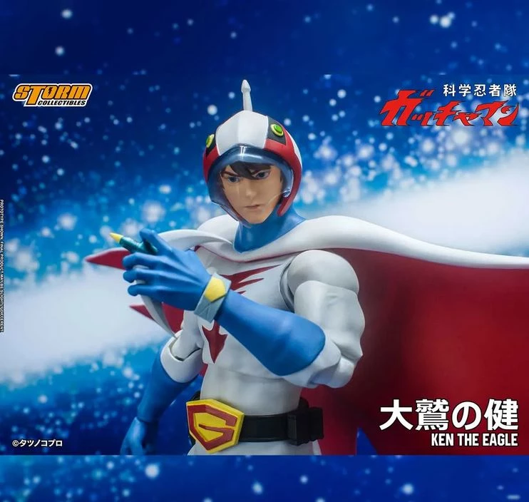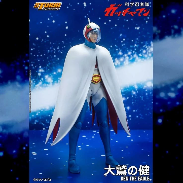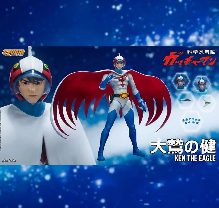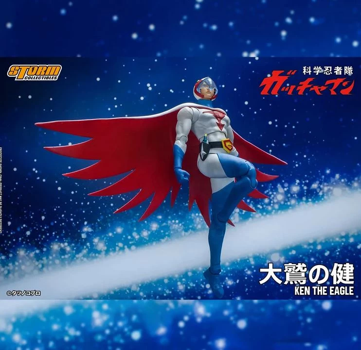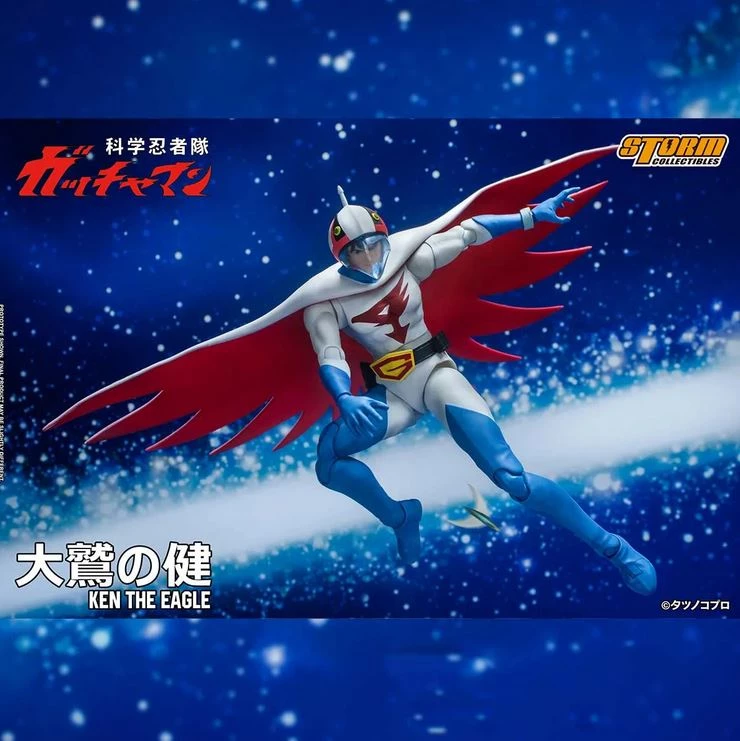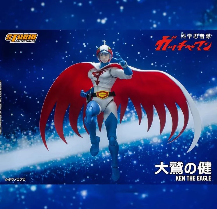 Science Ninja Team Gatchaman (科学忍者隊) is a Japanese animated franchise about a five-member superhero team, the original anime series debuted in 1972. KEN THE EAGLE (G1号 大鷲の健) is the team leader & tactical expert whose Bird Style is based off of the eagle. When not in costume, Ken works as an aircraft test pilot and delivers parcels by air mail.