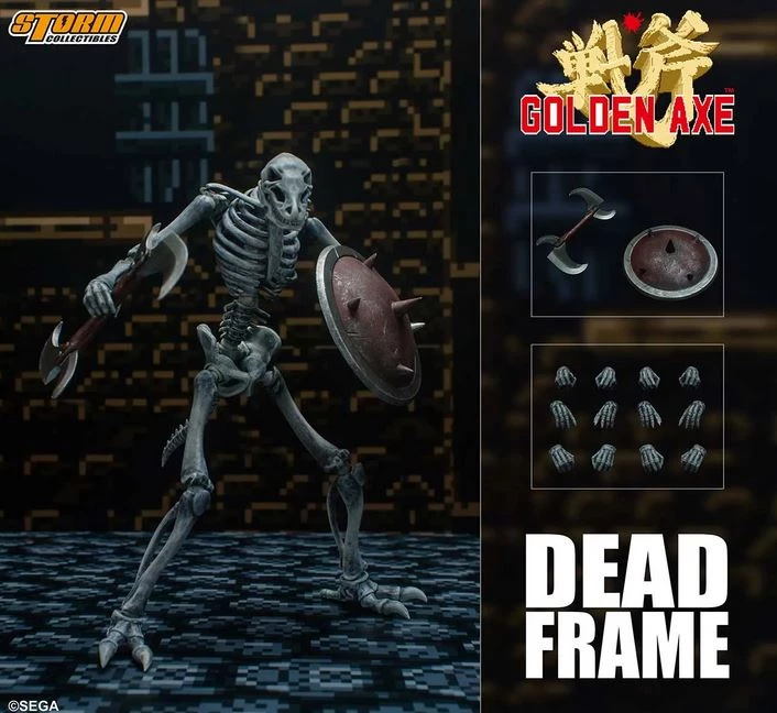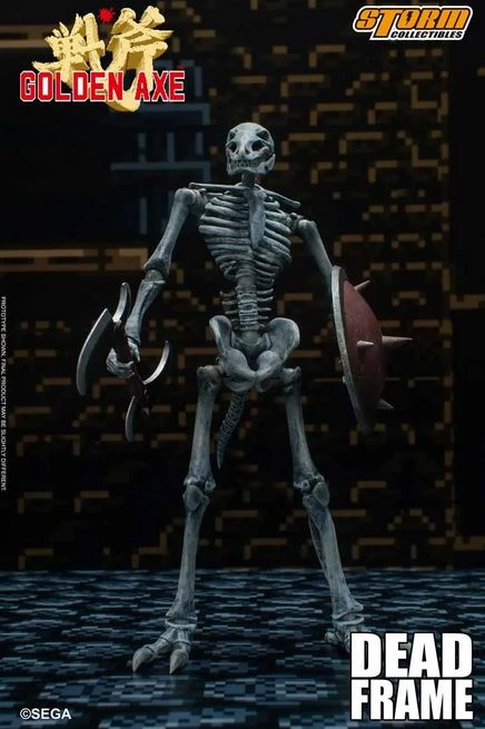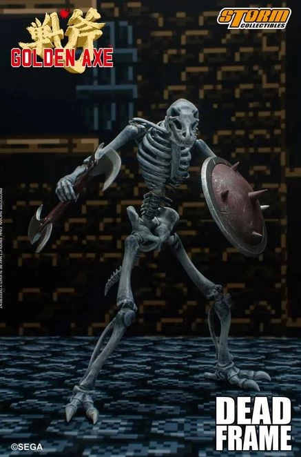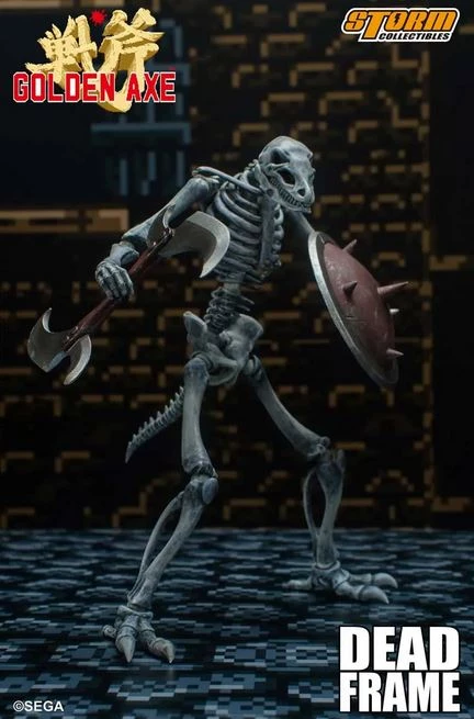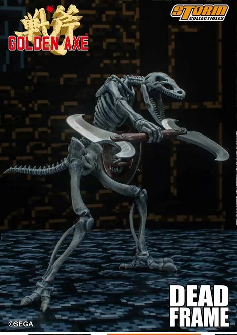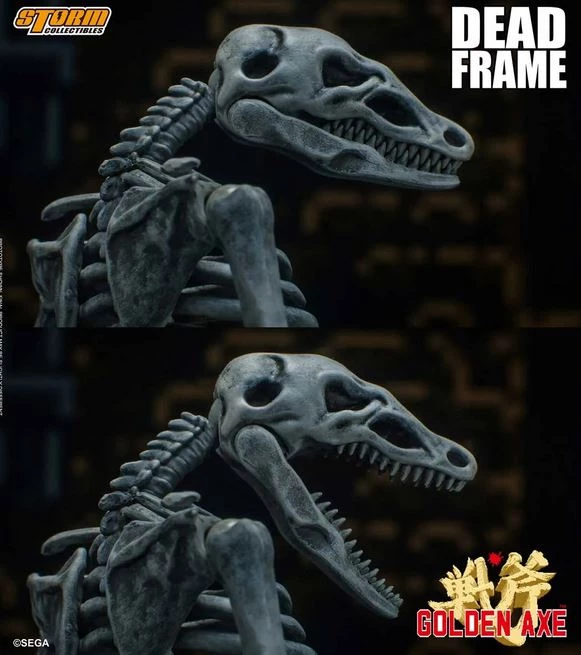 DEAD FRAME is an enemy from Golden Axe III. It is the bones of an ancient evil monster that has been brought back to life by the magic of Damned Hellstrike. The DEAD FRAME articulated lizard skeletons are 1:12 scale action figures. This is a 2-pack set.
