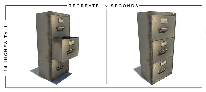 - One (1) 2.5″ wide x 6″ tall x 2″ deep – 3D Filing cabinet w/ removable drawer