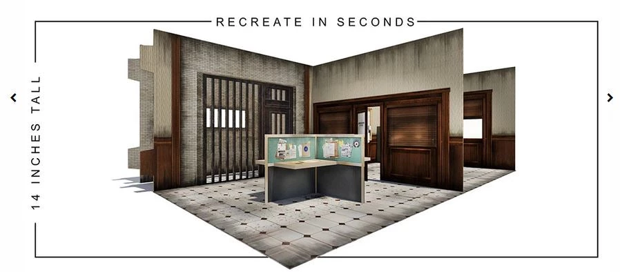 Also included is one 3D desk to fill out those important police reports. And the perfect place to stores those reports are one 3D cabinet that is also included. And when your detectives need to work on a case, the Police Pop-Up features one 3D four sided work station. This work station allows your action figure photography to show off the work the police deal with in the Multiverse. The final piece is one ground floor panel that brings the whole room together.
