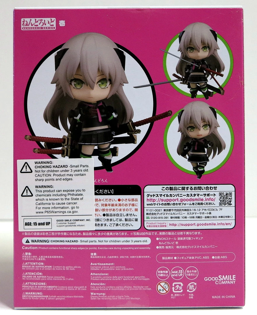Her three chibi-sized swords can be displayed unsheathed and combined with the included attacking effect parts, making for a wide variety of possible poses. She comes with three face plates including her standard expression, her shouting expression and a smiling expression perfect for cute Nendoroid form.