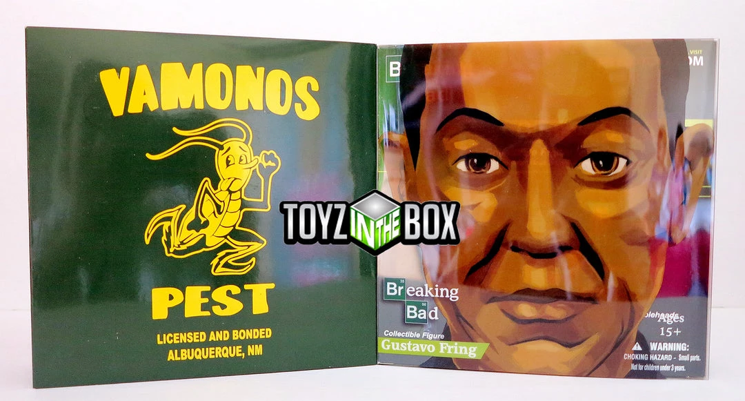 Gus Fring, the ruthless drug kingpin with the mild mannered, respectable exterior gets half of his face blown off by a bomb. Gus Fring is wearing his black and blue suit as seen in the episode, and is in the process of adjusting his tie. This Entertainment Earth Exclusive Gus Fring Action Figure also comes with a special slip case packaging. Gus Fring looks all nice and dapper in the package, but as you slide the slip cover down, poor Gus is shown with his half his face burned off! A true fan favorite, this 6-inch scale Entertainment Earth Exclusive Gustavo Fring Burned Face Action Figure wears one of his trademark suits and his ever-present glasses are removable. Dapper yet subdued, he appears harmless, but make no mistake, ice water flows through his veins and he can kill you without hesitation if you stand in his way.