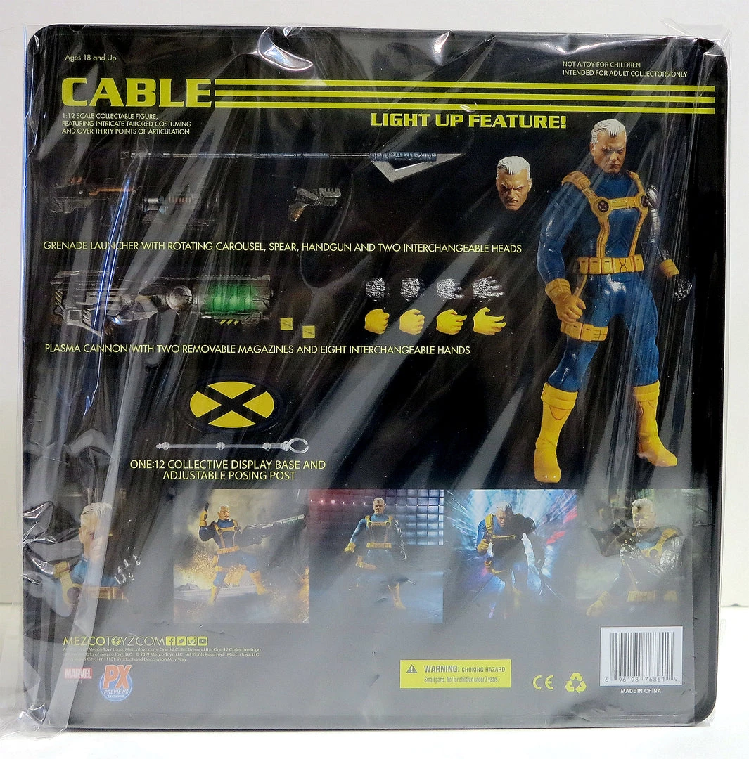A PREVIEWS Exclusive! Cable was sent to the future in a bid to save his life when he was infected by a techno-organic virus. Using his formidable telekinetic abilities and cybernetic enhancements, Cable battles super villain foes in his quest for peace. The X-Men Cable One:12 Collective Action Figure features a light-up function that illuminates his techno-organic eye in both of his head sculpts. The telekinetic mutant features a detailed cybernetic arm and is outfitted in a classic blue X-Men costume made from real cloth, along with flexible utility belt! Cable comes complete with a devastating arsenal of advanced weaponry: a plasma cannon with two removable magazines, grenade launcher with rotating carousel and handgun, spear, and separate handgun! Cable also comes with 4 sets of interchangeable hands and a One:12 collective display base with a stand featuring the X-Men logo!