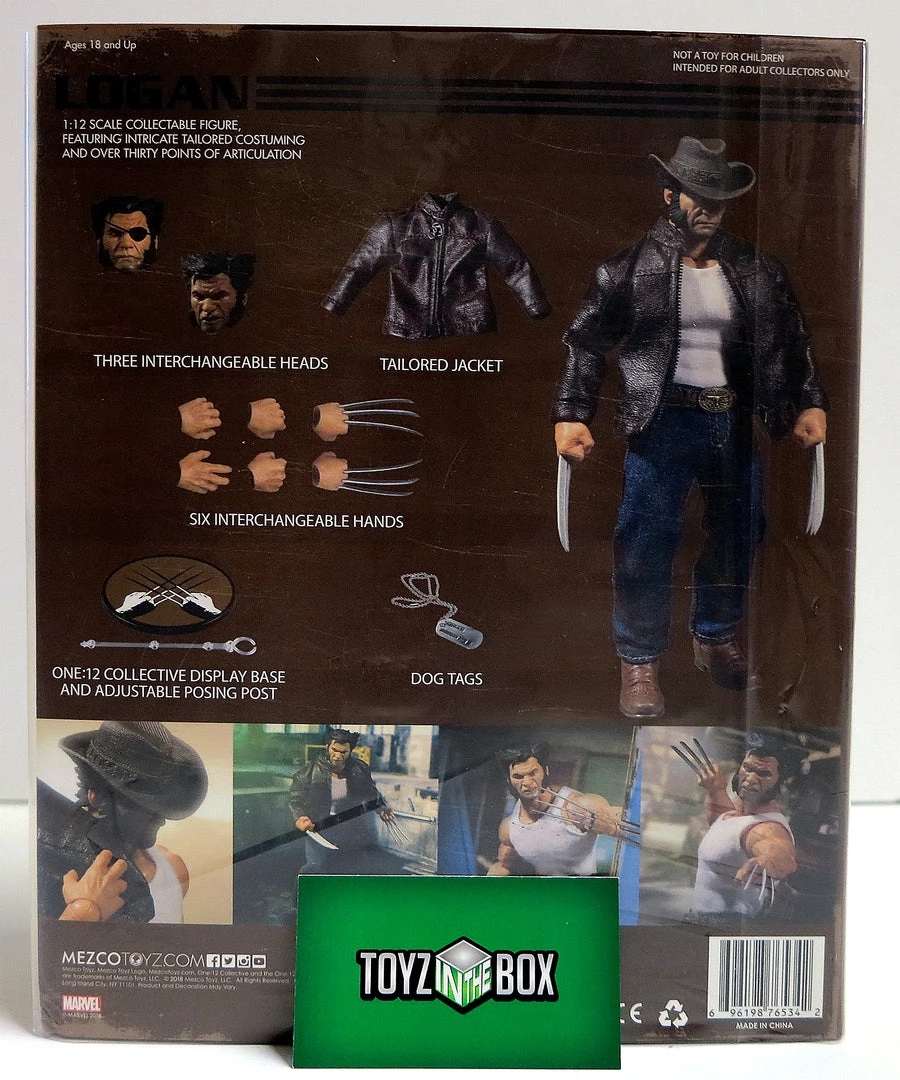 Soldier • Weapon • Mutant. The One:12 Collective Logan figure invokes his rugged and feral nature. He features three head portraits, a dog tag, a fitted tank-top with jeans, a belt with a western-style buckle, a leather-like jacket with a functional zipper, and cowboy boots. Logan comes with six interchangeable hands – both with and without his trademark claws extended.