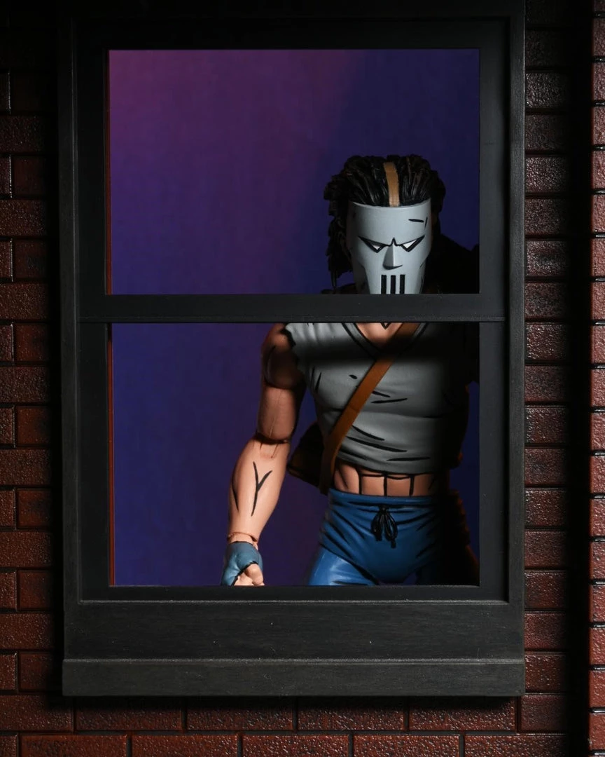 Casey stands approximately 7″ tall, and includes interchangeable heads and hands, plus hockey mask, golf bag, bats, hockey stick, and golf club! Comes in all new special comic-book themed window box packaging illustrated by Kevin Eastman. GOONGALA!