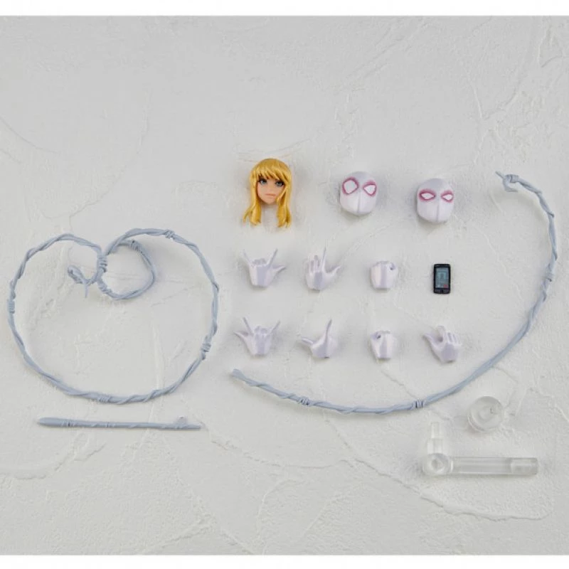 Comes with display stand, 3 interchangeable faces, 7 interchangeable hands, magnet parts so you will be able to display her attached to the walls and 3 different Spiderweb Effect parts.